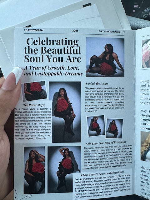 Whether you’re honoring a birthday, graduation, anniversary, or simply sharing love “just because,” this template helps you tell their story through bold headlines, photo sections, heartfelt messages, and thoughtful segments like “Behind the Name,” “Self-Love,” and “Chase Your Dreams.”
